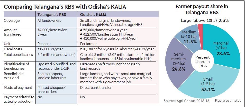 By making payments on a per acre basis, RBS is criticised for being regressive, i.e. as landholding size grew, so did the payment. As per calculations based on Telangana agri-landholdings and the RBS payout schedule, it was found that about 38% of RBS payouts went to farmers with greater than 2 hectares. KALIA is progressive as it makes a standard payment to all on just the condition that the individual is identified as a beneficiary. Besides, KALIA is only designed to deliver to small and marginal farmers, all others are outside the ambit of the scheme. Other farmers excluded from KALIA include ones paying taxes or having a government job.