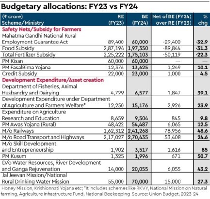 Another critical asset-creating expenditure head is PM Awas Yojana (Gramin). The overall outlay for PM Awas Yojana has risen to Rs 54,487 crore from Rs 20,000 crore budgeted for FY23, a net increase of 172.4%! However, if one compares the FY24 PMAY-G outlay to the FY23 RE of Rs 48,422 crore, the hike in FY24 is a more modest 12.5%. The scheme was launched in 2016 to provide housing for all, but it also ensures permanent asset creation for rural households and dignity of life, even as it creates more jobs in rural India. This marks a big step forward in reorienting subsidies towards rural infrastructure development.