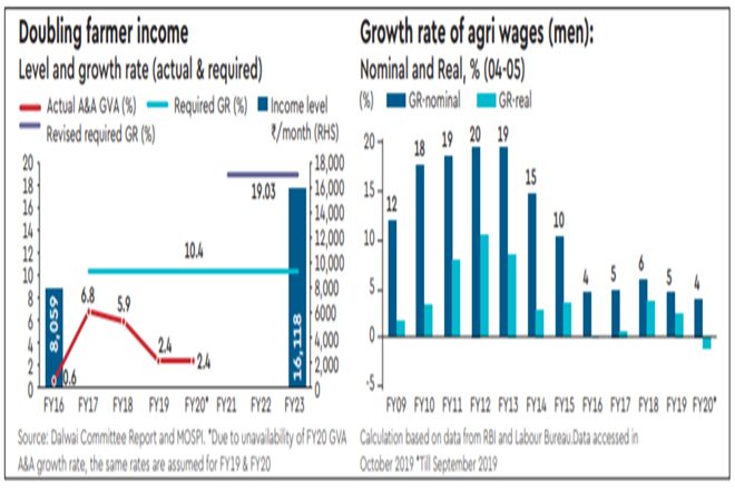 If the government still wishes to achieve the target of DFI, farmer incomes in the remaining three years (FY21, FY22, and FY23) have to grow at a CAGR of 18-19%, depending on the final estimate of GVA A&A growth rate for FY20. Considering an inflation rate of about 5%, the required growth rate in nominal terms, will be 23-24%! This type of agri-growth rate has never been achieved historically at an all-India level, at least in the recent past. However, states like Gujarat, Madya Pradesh, Chhattisgarh, and Rajasthan, among others, have delivered such growth in select years recently.