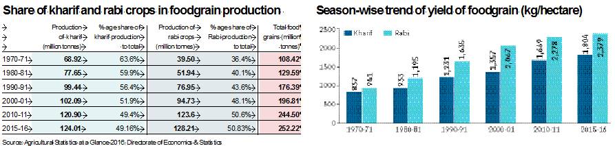 The total foodgrain production in India has more than doubled, from 108.42 million tonnes in 1970-71 to 252.22 million tonnes in 2015-16. More importantly, India is now the largest producer in the world of a host of farm products, be it jute or dairy or total pulses, buffalo meat and chicken products. This is nothing short of a revolution for a country that, not so long ago, had to approach the global market, cap in hand, to feed its millions, and it is widely acknowledged, not only in India, but globally as well. What is less known, however, is the shift in the seasonal cropping pattern that has accompanied this dramatic change, viz. the growing contribution of rabi crop vis-à-vis kharif. Despite the fact that the area under rabi crops is 22.4% less than under kharif, the share of rabi foodgrain production in total foodgrain production of the country has increased from 36.4% in 1970-71 to 50.83% in 2015-16. In contrast, the share of kharif foodgrain production has declined from 63.6% to 49.16% during the same period (see table).