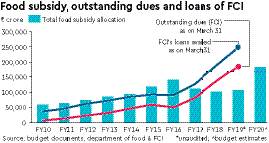 Let us first talk about food subsidy. In the budget for FY20, food subsidy is provisioned at `1,84, 220 crore, or let us say `1.84 lakh crore for ease. How many people are aware that the pending overdues of Food Corporation of India (FCI) stand at `1.86 lakh crore. Year after year, there is under-provisioning of food subsidy in the budget and FCI is asked to borrow more and more from banks so that the fiscal deficit of the budget can be shown to be under control. FCI loans from the banks have now crossed `2.48 lakh crore (see graphic).