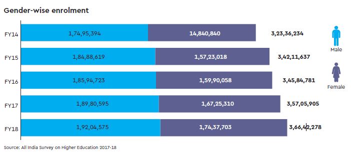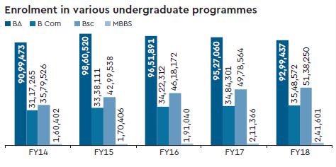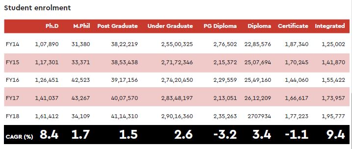 Overall, enrolment in higher education has grown considerably during the last five years. It increased from 3.24 crore in FY14 to 3.67 crore in 2017-18, a CAGR of 2.5%. Programme-wise, PhD saw a CAGR of 8.4% and post-graduation 1.5%.