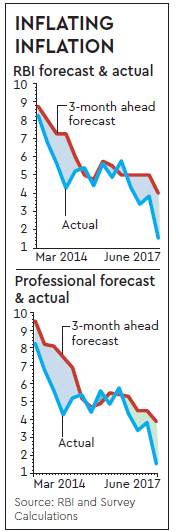 While Patra thought there could be second-round effects of HRA on inflation—Governor Urjit Patel felt it was something to watch out for—Chetan Ghate felt the impact would be muted due to “depressed demand conditions in the real estate sector”. And while others, like Pami Dua and Viral Acharya talked of the inflationary impact from farm loan waivers, Dholakia pointed out that no state had breached FRBM limits while making waivers. The Survey, on the other hand, argues the loan waivers will be contractionary since states will spend a lot less because of the need to fund them and this will not be compensated for by an increase in consumption by those that get the waivers. While members can have different views on the future, the question that arises is how long should MPC wait for known-unknowns to materialise—it could, theoretically, wait till next March or even later to take a call on the impact of loan waivers.