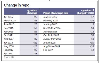 The accompanying graphic looks at the changes in interest rates developments since January 2015. The movements in the repo rate are mapped with the changes in the extent to which the WALR (weighted average lending rate) on fresh rupee loans sanctioned has moved.
