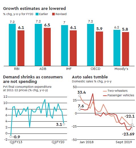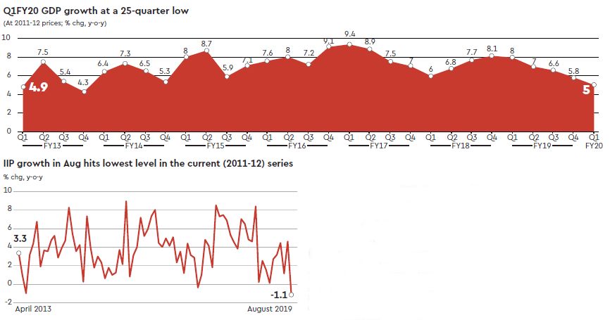 Given the fact that the economy grew 5% in the three months to June, the slowest in 25 quarters, and the high-frequency indicators showed no signs of improvement in the subsequent months, most agencies are lowering India’s growth projections for the current financial year. This week, the International Monetary Fund (IMF) cut its estimate for India’s growth to 6.1% from 7% projected in July. To address the cyclical weakness, the IMF urged the government to use monetary policy and broad-based structural reforms. Similarly, Reserve Bank of India had cut its FY20 GDP estimates to 6.1% from 7.2%, and the World Bank has lowered its forecast to 6%, down from 7.5% in April.