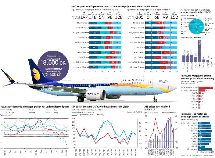 Jet Airways’s temporary shutdown will drive airfares upwards as the airline had a 15% domestic market share in October last year. It slipped to 11.4% in February this year. Its flight share in top-10 city-pair routes was 24% and it accounted for 14% of India’s international airlines capacity share.