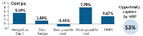 To assess this performance objectively, we conducted a post facto study by creating an opportunity envelope showing the best possible performance—where we hedge only when the spot rate on the due date is worse than the Day 1 forward—and the worst possible performance—where we hedge only when the spot rate on the due date is better than the Day 1 forward. As the accompanying table shows, the cost of hedging (3.67% pa) using MHP-I represents capture of 53% of the opportunity between the best and worst possible rates, which, in our view, is pretty good. Note, during this period, staying unhedged all the time would have delivered the best cost, even counting past month’s trauma; however, that is a non-starter , if for no other reason than to preserve your sanity.
