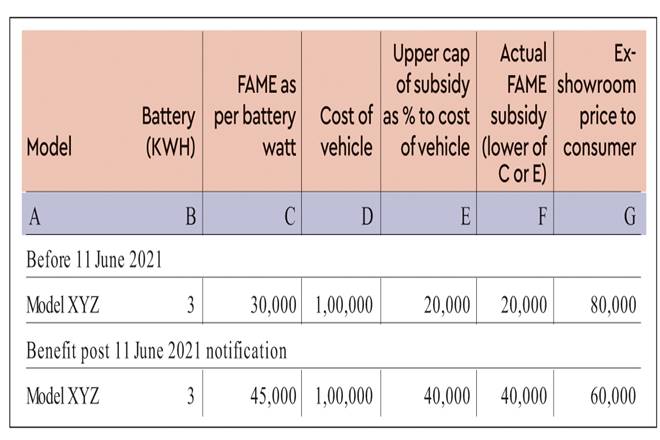 Under the FAME II (Faster Adoption and Manufacturing of Electric Vehicles in India) scheme, direct financial benefits are offered to electroic vehicles (EVs) manufacturers to help reduce the cost of acquisition by end-customers. As a mechanism, the original equipment manufacturers (OEMs) first pass on the subsidy benefit to end-customer (by way of reduced purchase price) and later claim the amount from the department of heavy industries (DHI).