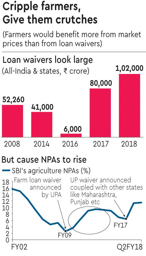 While the immediate impact of this is a big relief for farmers, as has been pointed out by many, this causes a spurt in NPAs as farmers across the board stop repaying loans in the hope their loans are also repaid by the government. A graphic by Macquarie Research (see graphics) shows how farm-loan NPAs for SBI rose from around 3% when the UPA announced its loan waiver in 2008 to around 12% now; in the interim, several states also announced their own loan waivers, adding to the pressure to default.