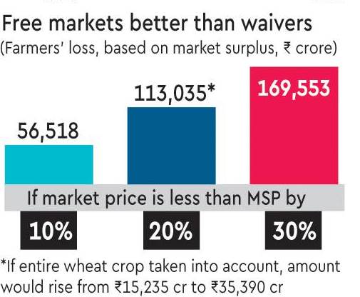 Another way to measure prices is to take the Minimum Support Price (MSP) announced by the government, and calculate the losses based on this. Right now, for instance, prices in the markets are around 25-30% below the MSPs announced for most crops since, in the absence of government procurement, the MSP amounts to nothing. Based on market prices being 20% below the MSPs, Icrier calculated the costs to farmers were around Rs 113,035 crore; this would rise to Rs 169,553 crore if prices fell to 30% below the MSPs. Icrier’s numbers are based on the marketable surplus, so the 58-60 mn tonnes of wheat and rice already procured today are not accounted for. This 58-60 mn tonne-procurement ensures a higher price for these crops, but think of the farmers whose crops aren’t procured and who have to accept lower market prices.