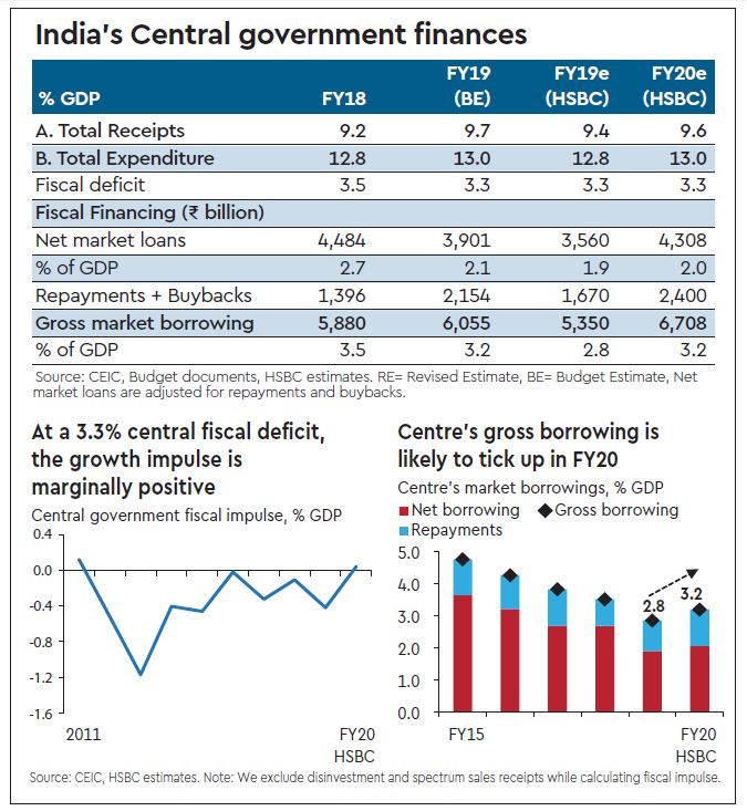 Any meaningful rural package is likely to lead to funding problems. Instead of the pre-announced FY20 fiscal deficit target of 3.1%, it is estimated the Central government will announce a number closer to 3.3% of GDP, because, if it announces a new package for rural India, fiscal slippage to 3.3% is likely. Only a very slight increase in capex (0.1% of GDP) is expected, since it is a year when reviving rural incomes is the main objective. With the FY20 fiscal deficit at 3.3% of GDP, net borrowing by the Central government is likely to grow much faster than nominal GDP. Adding to this (1) the fact that RBI’s