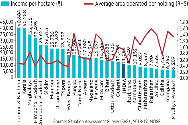 Interestingly, average landholding data is collected by both SAS and Agriculture Census (latest 2015-16), but there is a big variation between the two sets of data, especially for states like Punjab, Rajasthan, Haryana and Gujarat. As per SAS, average operated area per holding for Punjab is 1.44 ha (used in the accompanying graphic), but Census gives a much larger 3.62 ha average operational holding. If we normalise incomes of agri-households using census value for average holding sizes, Punjab’s rank sinks further—21st (with Rs 7,376 per hectare) out of 28 states, even lower than Bihar (Rs 19,338). It implies Punjab and Haryana farmers are earning higher incomes primarily due to bigger landholding sizes compared to other states.