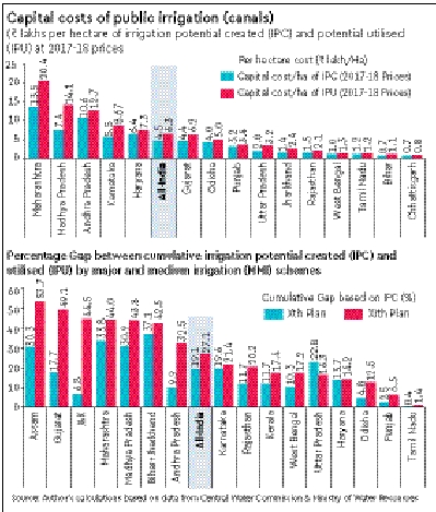 Let us look at the results. The attached graphic gives state-wise capital costs of public irrigation (canals, primarily through MMI schemes). Maharashtra tops the list with Rs 20.4 lakh/ha of irrigation potential utilised (IPU) compared to the all India average cost of just Rs 6.3 lakh/ha of IPU. The costs per hectare of IPC are somewhat lower, but Maharashtra is still the highest at Rs 13.5 lakh/ha. While the engineers and contractors are quick to announce IPC after construction of reservoirs and main canals, farmers benefit only when this potential created is converted to potential utilised, which is to be ensured by ministry of agriculture and farmers’ welfare.