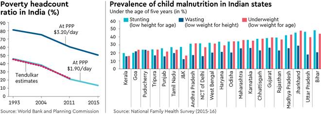 The World Bank’s estimates of extreme poverty, defined as $1.9 per capita per day at the 2011 purchasing power parity, show a secular decline in India from 45.9% to 13.4% between 1993 and 2015 (see graphic). If the overall growth process continues, as has been the case since, say, 2000, India may succeed in eliminating extreme poverty by 2030, if not earlier. Also, given the overflowing stocks of foodgrains with the government, and a National Food Security Act (NFSA) that subsidises grains to the tune of more than 90% of its cost for 67% of the population, there is no reason not to believe that India can also attain the goal of zero hunger before 2030.