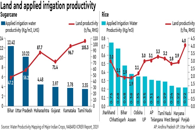 If we have to use our water more wisely in agriculture, two crops—rice and sugarcane—deserve special attention. As per a NABARD-ICRIER study on water productivity mapping (bit.ly/3ct9Tmd), these two crops consume almost 60% of India’s irrigation water. The accompanying graphic shows applied irrigation water productivity against land productivity for rice and sugarcane in important states growing these crops. It is interesting to see while Punjab scores high on land productivity of rice, it is at the bottom with respect to applied irrigation water productivity. Similarly, in case of sugarcane, irrigation water productivity in Andhra Pradesh, Karnataka, Maharashtra and Tamil Nadu is only a third that of Bihar and UP. Thus, there is a need to realign cropping patterns based on a per unit of applied irrigation water productivity.
