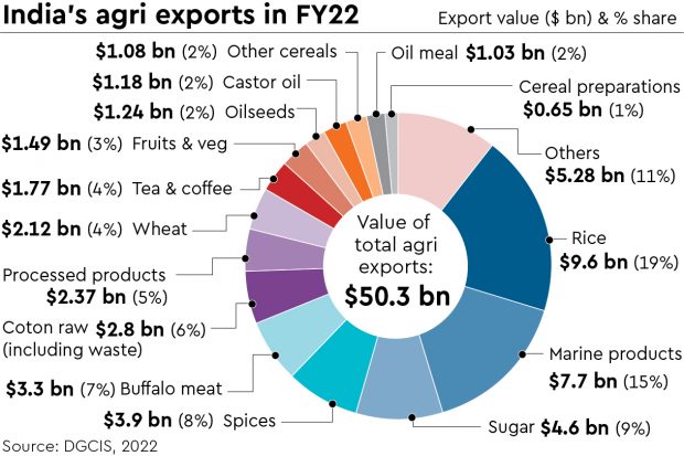 In FY22, India’s agri-exports reached an all-time high of $50.3 billion, registering a growth of 20% over the preceding year. This was largely made possible by rising global commodity prices, but also by favourable and aggressive export policy and various export promotion agencies like Agricultural and Processed Food Products Export Development Authority , Marine Products Export Development Authority, and commodity boards, etc. However, a strategic question that arises is: How sustainable is this growth in agri-exports, given India’s resource endowments and its own needs? Already, there has been a sudden ban on wheat exports. To answer this rationally, let us first look at the composition of agri-exports.