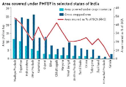 In brief, the answer is ‘no’. One does not see PMFBY achieving its target of 50% of GCA by 2018-19. Except a few states (see graph), India’s current insurance cover is about 30% of GCA. As against this, China insures about 70% of its GCA and the US extends insurance cover to about 90% of GCA. The prime reason behind PMFBY’s lacklustre performance is that it suffers from several administrative glitches and typical red-tape that does not inspire farmer-confidence as farmers have to wait for months and even years, to get compensation for their crop-losses. The PMFBY involves farmers, banks, state and central government, insurance companies and re-insurers. The most important role, however, is played by the state government which finalises the insurance company for every cluster through open tenders, pays half of premium subsidy, conducts crop cutting experiments, and submits data of crop yield to the concerned insurance company.