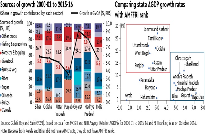 In order to grow faster, the requirement to undertake policy reforms, mainly related to marketing, emerged a key driver and predictor of future growth. We mapped (see graphic) the historical agricultural growth rate averages of Indian states against the state-wise ranks on NITI’s Agricultural Markets and Farmer Friendly Reforms Index (AMFFRI). (This index evaluates Indian states on the extent to which each of them undertook required agri-reforms; low AMFFRI rank implies the state is undertaking desired reforms. The lower the rank, the better.) It was found that th states that undertook reforms (and were ranked low on the AMFFRI) witnessed a relatively faster agri-GDP growth rate (blue box in graphic), and those that didn’t undertake reforms (ranked high on the AMFFRI) witnessed relatively lower agri-GDP growth rates (red box).