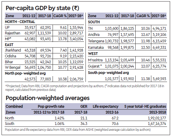 Northern states have larger populations and higher population growth rates of 1.42% on average, compared to 1.06% in the south (see graphic). This correlation implies that a large swath of India’s population has insufficient income, low contribution to GDP and high population growth rate, while a smaller group has very high income, proportionally high contribution to GDP and low population growth rates. This population-weighted inequality is unsustainable.