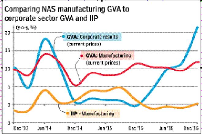 The standout growth was in the manufacturing segment (8.3%) which—demonetisation or otherwise—is largely perceived to be faltering, seen through the lens of the Index of Industrial Production (IIP) and partially through the tepid corporate results. The accompanying chart explains some part of the underlying constructs. The CSO press release for Q2 FY17 (as also PRs for many previous quarters) states that for the manufacturing segment, “the private corporate sector growth (which has a share of over 70% in the manufacturing sector) as estimated from available data of listed companies … The growth in quasi-corporate and unorganized segment which … has a share of around 22 percent … has been estimated using IIP of manufacturing”. That’s a combined 92% of manufacturing GVA.