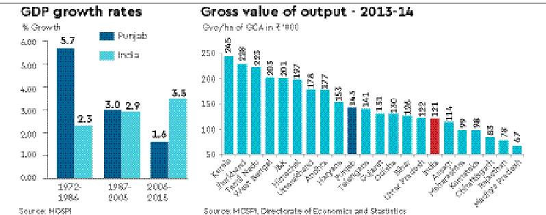 Punjab has been a star performer in agriculture during the heydays of the Green Revolution. Its agri-SGDP growth rate was 5.7% per annum during FY72 to FY86, more than double of the all-India average, 2.3%. But thereafter, the Green Revolution started greying, and growth rate of Punjab agriculture fell to 3% per annum during FY87 to FY05, almost same as all-India’s 2.9%. However, during FY06 to FY15, Punjab agri-growth slipped to just 1.6%, less than half of the all-India average of 3.5% (see accompanying graph). During this period, some states like Madhya Pradesh delivered an agri-growth rate as high as 9.7%.