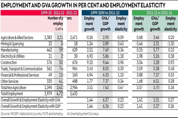The accompanying graphic provides overall employment, compound average annual employment growth, growth of gross value added in the sectors and employment elasticity for two periods (period I being 1999-2000 to 2011-12, and period II being 2011-12 to 2021-22).