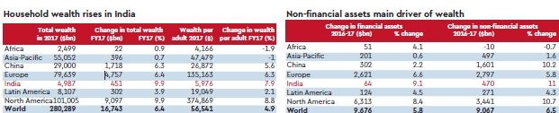 Financial assets continue to make a substantial contribution to growth of wealth, accounting for half of the increase in wealth. Non-financial assets, too, have grown at a similar pace over the past few years. Non-financial assets are now the main driver of wealth growth in most regions. Personal wealth in India is dominated by property and real assets, which make up 86% of household assets.