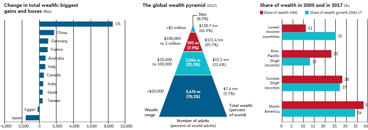 Globally, wealth growth outpaced population growth, so that global wealth per adult grew by 4.9%, raising global mean wealth to $56,540 per adult, a new record high. However, inequality has continued to grow upwards. As a result, despite higher mean wealth per adult, median wealth fell this year.