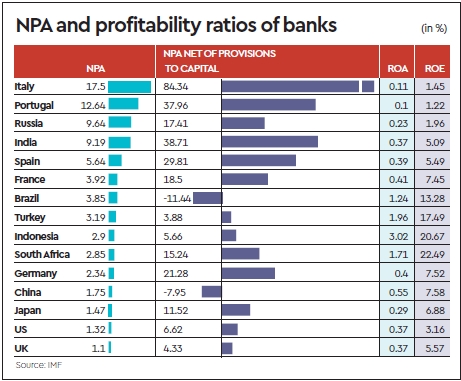 The second column gives data on the ratio of NPLs adjusted for provisions to capital, which is a better way of depicting NPLs in relation to capital. Here, too, we do not do well with 38% of capital being vulnerable to be wiped out on this score. Italy is disastrous, while Portugal comes close to India. Spain is quite high at 29% and Germany, surprisingly, with lower NPL ratio has 21% of capital being vulnerable to NPLs. This ratio is important as it captures the combination of NPA and capital adequacy as it indicates the adequacy of capital in the light of impaired assets.