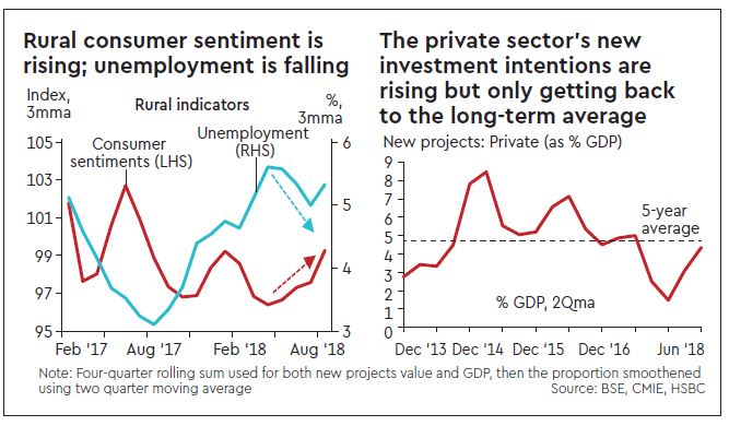 After falling for four years, India’s investment rate bottomed in early 2017 and has risen gently since. And yet, any sustained acceleration in investment growth is still some distance away. The recent improvements only seem to be closing the gap with the five-year average. Real credit growth to industry is ticking up but only marginally. Earlier work found that world growth, expected excess domestic future returns (growth – interest rates), economic policy uncertainty, and corporate indebtedness, together, can explain India’s investment growth rather well. Currently, these ‘explanatory variables’ are painting a mixed picture. The world’s growth outlook is better than before, but uncertainties are mounting; and domestic corporate indebtedness is falling, although ever so gradually. While these could support an investment revival, other drivers, such as increased policy uncertainty as we near the general elections in 2019, tighter financial conditions, and the overhang of India’s banking sector problems, could blunt any meaningful acceleration in private capex growth before 2020. We expect the investment rate to remain stable over 2018-19 and to only accelerate meaningfully in 2019-20, once private sector participation rises sustainably.