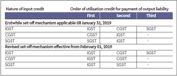 Recently, the government amendment the set-off mechanism of input tax credit to be effective from February 1, 2019. As per the amended set-off mechanism, which is covered under section 49A of the CGST Amendment Act 2018, a GST registered person is required to first utilise its entire IGST credit towards the payment of output IGST liability. The balance of IGST credit will then be used for payment of CGST and SGST liability, respectively. The credit balance available in the SGST and CGST credit pool can be used only when the IGST credit pool is fully utilised. The accompanying table shows the erstwhile set-off mechanism which was operational till January 31, 2019, and the revised set-off mechanism effective February 1, 2019.