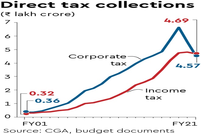Nowhere is the disparity between the formal and informal sectors seen more starkly than in the GVA; India’s GVA contracted 6.2% in FY21 while the proxy for India Inc’s GVA—the sum of the ebitda plus employee expenses—went up by a remarkable 18%. The variance could be even higher when the numbers are revised, given the data initially capture more of the organised sector’s performance than that of the unorganised sector. The government’s total revenues (including disinvestment proceeds) for the current year are likely to fall short by more than Rs 1 lakh crore; the deficit could also be wider than Rs 15.06 lakh crore if it spends as budgeted. A hike in corporation taxes could ease the pressure.
