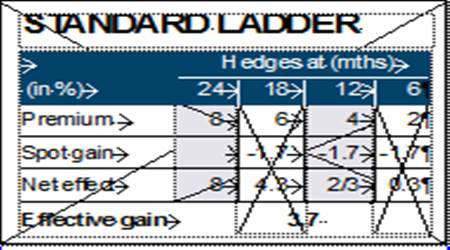 Clearly, a 100% hedge would, on average, produce a better return than this but few companies, if any, would hedge 100% to 24-months for fear of losing out if/when the rupee fell sharply. Many companies who have been running 24-month books for some time use a ladder approach, which, in its simplest form would involve hedging 25% at 24 months, a further 25% at 18 months, another 25% at 12 months and the balance at 6 months, the idea being they would hope to benefit from rupee depreciation in excess of the 2% premium give-up in each interim period. However, we found that, on average, using the same test period, this strategy would lead to even worse results. This is because over any 6-month horizon, although the rupee depreciated more often (but still only 44% of the time), the average return was negative 1.7% (rupee strengthened). Thus, at each interval, the company was giving up a 2% gain and on average getting a 1.7% loss (on spot). Thus, the calculated return on this approach is well below the return in either of the other two approaches discussed.