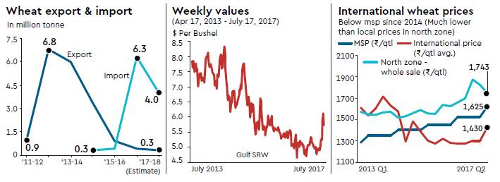 Imports are a natural outcome of international prices being lower than local costs after adding freight and handling expenses. There could be diverse reasons for the steep fall since 2014 in wheat values abroad, but this has been primarily due to higher output in Black Sea countries (comprising Russia, Ukraine and Kazakhstan) and an exceptionally good Australian crop last year. Trend reflecting fall in values of US SRW wheat since 2014 are showcased in the accompanying chart. Wheat values came down from $300 fob/tonne to $220 fob/tonne—down by 27%—as of now, but had touched a bottom of $170 fob/tonne in September 2016, a 43% decline. However, the Indian MSP climbed from Rs 1,400 per quintal in 2014 to Rs 1,625 per quintal, or 16% higher, while import prices fell to Rs 1,275-1,430 per quintal against India’s wholesale market price in North Zone of about Rs 1,550-1,800 per quintal. Since a bulk of imports land in South Indian ports, for millers, the wholesale traded value in the South are Rs 2,300 per quintal—while imported wheat with 10% duty is around Rs 1,800 per quintal. Open Market Sale Scheme (OMSS) price of Rs 1,790 per quintal plus freight also incentivises imports in preference to local deliveries from Food Corporation of India (FCI).