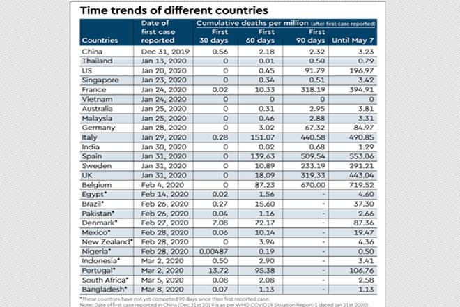 The UK—which initially selected ‘herd immunity’ as its chosen route and shunned social distancing and lockdown—saw a sharp jump in death rates between 60 to 90 days, and has now gone into a lengthening lockdown. The US, which has had a chaotic mix of control measures—that varied from state to state and time to time—experienced a sharp rise between 60-90 days, and the rate was still rising sharply on May 7. The cumulative death rates per million, however, place it below the UK, France and Belgium. At the next G7 meeting, Germany can look at others in the eye and speak of how successfully the rise in the cumulative death rate was contained after day 90 and kept below the others. India can do that at the next G20 meeting, with a steady rate of rise recorded at very low levels of deaths per million.
