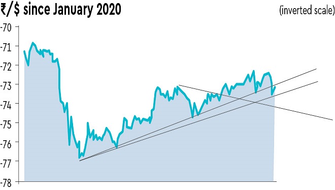 And then, of course, there is the NDF market, which has been enjoying/driving the uncertainty. The spread at 1 month is running at around 10 paise every day for the past month or so, which makes it clear that, despite strong inflows, there is continuing speculation against the rupee. The accompanying chart shows that the rupee, which slipped suddenly early last week, bounced back strongly from a medium-term technical support line that started when the rupee fell sharply to near-77 at the start of the pandemic.