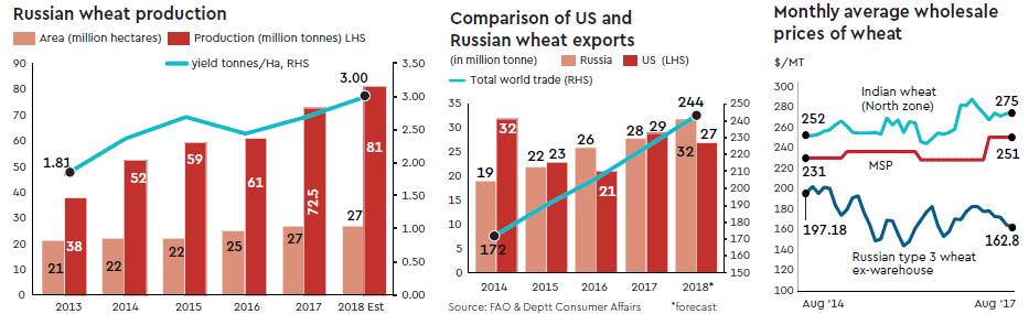 Indian flour millers blend imported wheat with local wheat for getting specified specifications of flour. Low-priced imported wheat lowers wheat quotes and wheat flour inflation. From India’s perspective, surpluses of Russian wheat and its price of around $190 per tonne landed/CIF, it costs about $234 per tonne, or Rs 15,000 (10% duty paid plus expenses of Rs 1,500 per tonne), which is lower than Indian local market prices of about Rs 16,000-17,000 per tonne, or $250-275 per tonne, in Indian north zone (Department of Consumer Affairs). The price of Indian wheat in the south zone will be much higher. Thus, it prompts imports from Black Sea and Australia. The downward price pressure on Russian crop will continue over the next three months, and is bound to exert corresponding bearish sentiment on Indian wheat. Import intensity can rise with another $10 per tonne fall in prices, making imported grain cheaper, lowering local values that will not be remunerative to Indian farmers. Though some cargoes, earlier imported at $220 CIF/tonne prices, and old stocks stuck with importers may have slower lifting at a marginal loss, new contracts at $180-190 CIF will make up the loss, provided import duty is not hiked from the existing level of 10%. The IGC expects India to import about 3 MT by March 2018, of which 0.2 MT has arrived so far. In addition, higher duty will completely block any imports from Australia, where production is down and prices are averaging about $260 CIF.