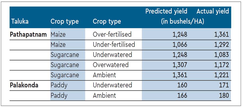 Once the algorithm was finalised, crop output projections were made by the satellite team and this was measured against independent data from the ground team. This used the conventional crop-cutting experiments (CCE) that India uses—every year, India has 4 million CCEs in different parts of the country to determine crop yields and losses. When the results were matched, SatSure found it was getting it right 85-90% of the time (see table) for different types of agriculture practices. So, in the case of maize that was grown on over-fertilised land in Pathapatnam, the satellite team predicted an output of 1,248 bushels per hectare versus, when the actual crop came in, a yield of 1,361 bushels.
