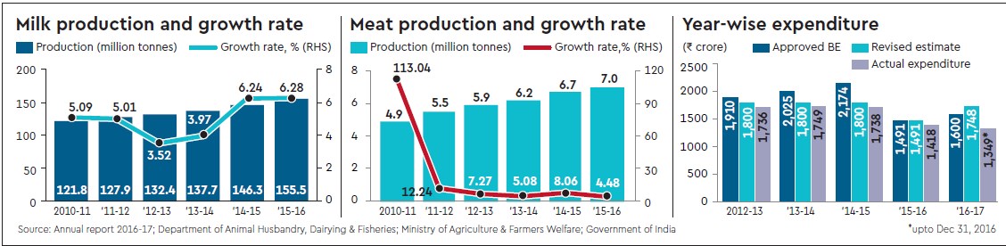 Even though there has been a considerable improvement in animal health infrastructure and manpower yet diseases like foot and mouth disease, peste des petits ruminants (PPR) and influenza occur frequently and restrict realisation of the production potential. Food safety is also becoming an important concern. This calls fora paradigm shift in animal health policy from curative to preventive management and improvement in delivery of livestock services. Fostering rapid growth in livestock sector needs sturdy financial support. Livestock’s share in total agricultural credit has rarely exceeded 5%. Financial institutions treat credit to livestock sector as investment credit that attracts a higher interest rate and is often advanced against collateral. The cost of raising a milch animal is about 75% of the variable cost of cultivation paddy or wheat in a hectare. This compels for provision of short-term credit for animal husbandry. Institutional mechanisms to protect animals against risk are also not strong and require significant improvement. In the past five years, only 5.3 million animals, mostly high-producing cattle and buffalo, have been insured.