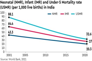 What we need to note however is that, in the case of mortality rates, no matter how you measure, there is a significant drop over time. The mortality rate for the under-5 age group (U5MR) has fallen from 88.1 in 2001 to 32.6 in 2020, per 1000 live births (see graphic).