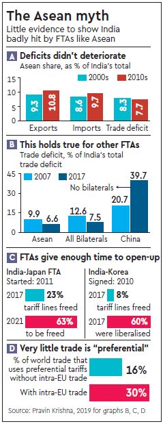 Pravin Krishna of Johns Hopkins University points out in a recent paper that between 2007 and 2017, India’s trade deficit with Asean (as a percentage of India’s total trade deficit with all countries) fell from 9.9% to 6.6%. For all bilateral agreements that India has, such as with Japan, Korea, etc, this fell from 12.6% to 7.5%. The numbers will vary depending on the year—the number for 2018 could be different than that for 2017—but, there is no evidence of a catastrophic impact of FTAs, either bilateral or plurilateral. Indeed, the sharpest deterioration in India’s deficit is with China, a country it has no FTA with; once again, FTAs are not the problem.