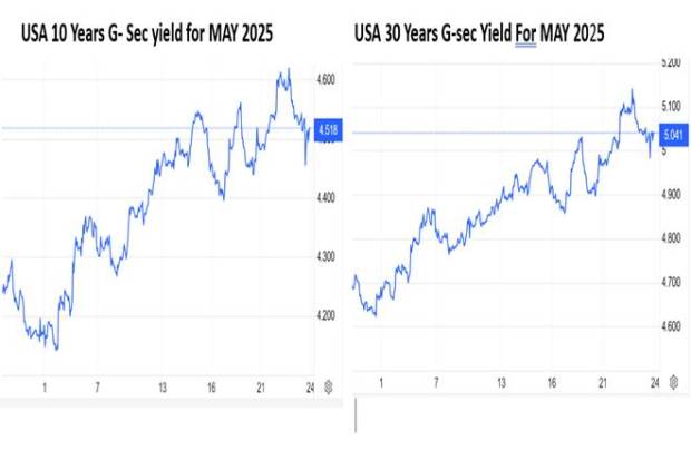 Moreover, persistently high yields may lead to the accumulation of additional fiscal debt, particularly if governments continue to borrow to finance budget deficits or stimulate slowing economies. An expanding debt burden not only increases vulnerability to future rate hikes but can also erode investor confidence, potentially triggering credit rating downgrades or rising risk premiums, Moody’s downgraded the U.S. credit rating one notch to Aa1 from Aaa on May 16, 2025. Over time, this can create a self-reinforcing cycle where higher debt leads to higher interest costs, which in turn further widen fiscal deficits. In the long run, such dynamics may compel policymakers to consider austerity measures or tax hikes, both of which could dampen economic activity and weaken consumer and business sentiment. Thus, the rise in bond yields has far-reaching implications beyond financial markets, posing structural challenges to fiscal sustainability and macroeconomic stability.