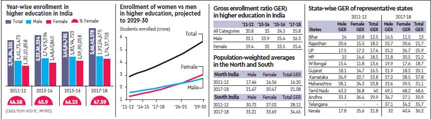 *Women are progressing faster than men. In North India, the average female GER jumped 5.91 points from 2011-12 to 2017-18, whereas the male GER moved 4.03 points. In South India, the female GER jumped 6.67 points whereas the male GER moved 4.49 points.