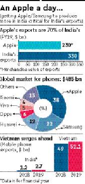 While the temporary (?) patch-up between the US and China has meant that big producers in China have no immediate pressure to leave the country (with trade sanctions, their China exports would have been hit by import duties in the US); at the same time, the government has not made any concrete offer to the big mobile phone manufacturers either. Indeed, while estimates are manufacturing in India is around 19-23% more expensive than in China, and 10-12% as compared to Vietnam—due to poorer infrastructure here, and lower fiscal incentives—India has lowered the export incentives it gives for mobile phone exports; this was 4% of the value of the phone till January, when it was reduced by half, as a result of which, this year’s exports are likely to be lower than last year’s.