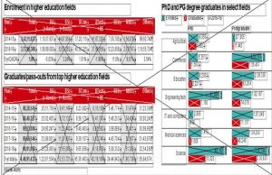 In 2018-19, 1.69 lakh students were enrolled in PhD programmes, while 39.8 lakh were enrolled in PG programmes. This amounts to 0.45% (PhD) and 10.6% (PG) of total enrolment. The breakup in select fields shows 6,000 PhDs and 27,800 PGs in agriculture, 5,400 PhDs and 4.5 lakh PGs in commerce, 6,200 PhDs and 2 lakh PGs in education, 41,900 PhDs and 1.82 lakh PGs in engineering and technology, 2,870 PhDs and 1.97 lakh PGs in IT and computers (in addition to computer engineers in the engineering and technology category), 7,400 PhDs and 1.59 lakh PGs in medical sciences, and 44,700 PhDs and 5.87 lakh PGs in sciences. A total of 40,813 PhDs and 15 lakh PG degrees were awarded. India needs more specialists to lead research and innovation efforts across several disciplines.
