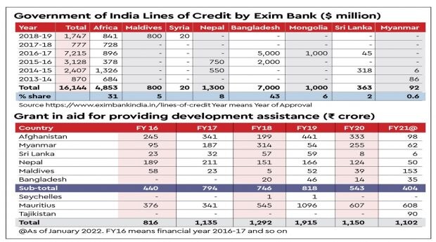 The answer to Lok Sabha Question 3848 of March 2022 stated, “Besides lines of credit Grant in aid assistance projects are being implemented in Afghanistan, Bangladesh, Mauritius, Nepal, Sri Lanka, Seychelles, Maldives, Myanmar, and Tajikistan.”