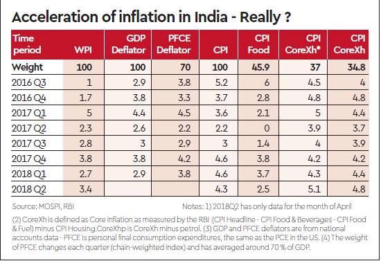 This inflation indicator shows the following trend for the last five fiscal years, starting in FY14: 7.5%, 5.3%, 3.9%, 3.8% and 3.3% (see table). Yes, 3.3% in FY18 is lower by 50 bps than the demonetisation year of FY17. We apologise, we digress. Back to impending viral inflation in India. The 100 bps increase in core inflation is only according to RBI’s wrong definition of core, i.e., excluding food and fuel. But, in India, petrol (what is considered fuel in most parts of the world, and not the price of kerosene or electricity) is part of transport and communications, and as far back as December 2014, then RBI Governor Raghuram Rajan had pointed out the “havoc” that just 2.4 % of the consumption basket—the consumption weight of petrol—could cause.
