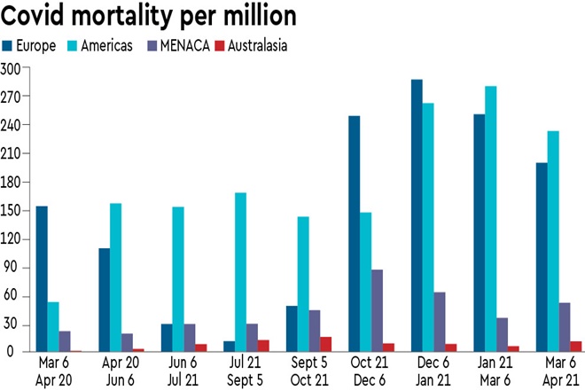The accompanying graphics have aggregated Covid-19 mortality data in deaths per million to equalise for population differences across countries. Second, mortality is calculated for six-weekly intervals beginning March 6, 2020. This is when Covid-19 mortality, initially confined to China, started rising globally. There are nine six-weekly intervals in all, the last ending on April 21, 2021. Third, the data is from 37 major countries, and includes all countries with Covid-19 deaths exceeding 20,000, with the exception of South Africa (53,887 deaths so far). Together, these countries account for about 88% of Covid-19 mortality, and 72% of the global population. Fourth, the data is aggregated into four regions for analytical reasons. The regions are the Americas (10 countries), Europe (13 countries), MENACA (six countries), and Australasia (eight countries). Mortality in the rest of Africa (with the notable exception of South Africa) is minimal, and it has, therefore, been excluded from the graph to keep things simple.