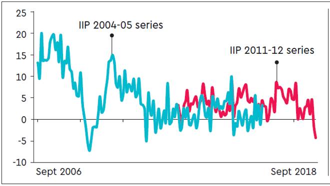 The September growth rate of the Index of Industrial Production (IIP) was –4.3%, fairly headline hogging. Although such a performance was anticipated to an extent, it still serves to draw attention to the depth of the manufacturing slowdown (the August growth rate was also was revised further down, from –1.1% to –1.4%). This is the deepest negative growth in the 2011-12 series (see graphic); even in the previous 2004-05 IIP series, such sharp slowdowns were relatively rare. What should we make of this?
