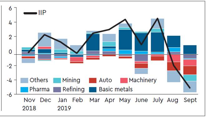 The proximate sources of the September IIP slowdown were mining, (growth contracting 8.5%) and electricity generation (growth contracting 2.6%). This can be attributed to the excess, prolonged rains in the mining belts, and is likely to be transient. There is also some indication that the negative growth in petroleum refining might have been due to some maintenance related refinery closures, but more on this later. However, the weakness is quite broad-based, even in consumer non-durables (FMCG); this is probably representative of squeezed purchasing power, and, hence, demand weakness. The patterns of the individual industries in the manufacturing segment, which accounts for the bulk of the slowdown given its large weight in the IIP are, however, illustrative.